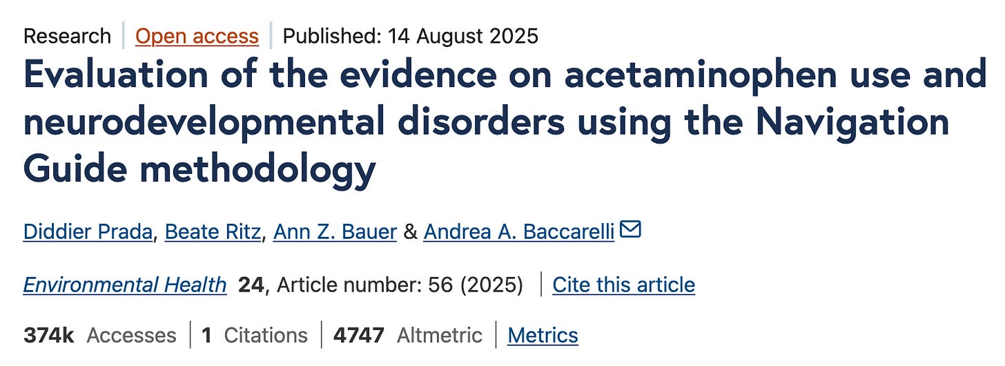 1. What about the Harvard study, though? I assume most people asking this were referring to a study that came out last month, conveniently just before RFK Jr’s self-imposed deadline of figuring out the cause of autism by September, with a senior author from Harvard. The other authors are at Mt. Sinai, UCLA, and University of Massachusetts. One thing I found interesting about this was the same folks who are anti-intellectualism all of a sudden seemed more than happy to throw the Harvard name in my face. But let’s talk about why this study isn’t causing physicians, scientists, and medical societies to panic about acetaminophen (the active ingredient in Tylenol). The study itself is a review. It is not, as some said in my comments, a meta-analysis. That is because there was too much heterogeneity, meaning the studies were too different from each other, to combine them. Of the 46 studies in the paper, only 7 looked at autism as an outcome. Overall, the authors concluded the data showed a correlation between acetaminophen and autism, but the study design did not allow them to make any causal conclusions. This, btw, is the same conclusion in the FDA letter that was distributed after the press conference, despite the fact that Marty Makary told the press the study showed a causal relationship.