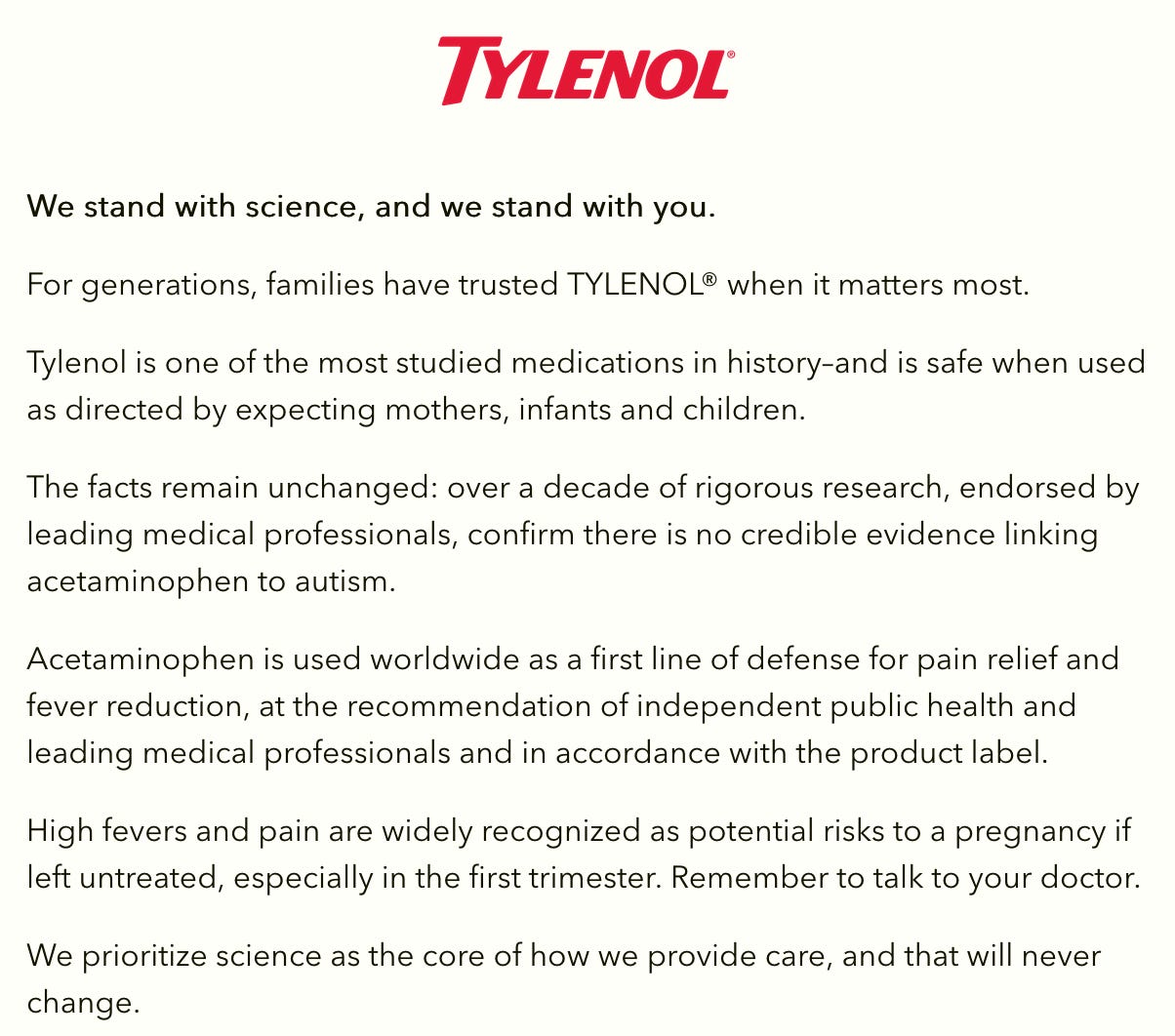 4. But even Tylenol themselves said pregnant people shouldn’t take it. This refers to a tweet from 2017, which appears to be from the company’s main account. The tweet says, “We actually don’t recommend using any of our products while pregnant. Thank you for taking the time to voice your concerns today.” The company has now said that tweet was “taken out of context.” Although I am not sure what that context is, I do want to point out they have put out a statement this week that is counter to that tweet. For reasons that are likely obvious, the HHS account and the White House account both shared that tweet, but not the updated statement. I’m not saying this because we should take a company’s word on their product—they obviously have a vested interest in convincing people it is safe and effective—but because people keep bringing up that tweet. Here is their updated statement, which is an automatic pop-up if you go to their website. Notice they say, “Tylenol is one of the most studied medications in history—and is safe when used as directed by mothers, infants and children.” They also say they do not make recommendations on medications during pregnancy because “that is the job of a healthcare provider.”